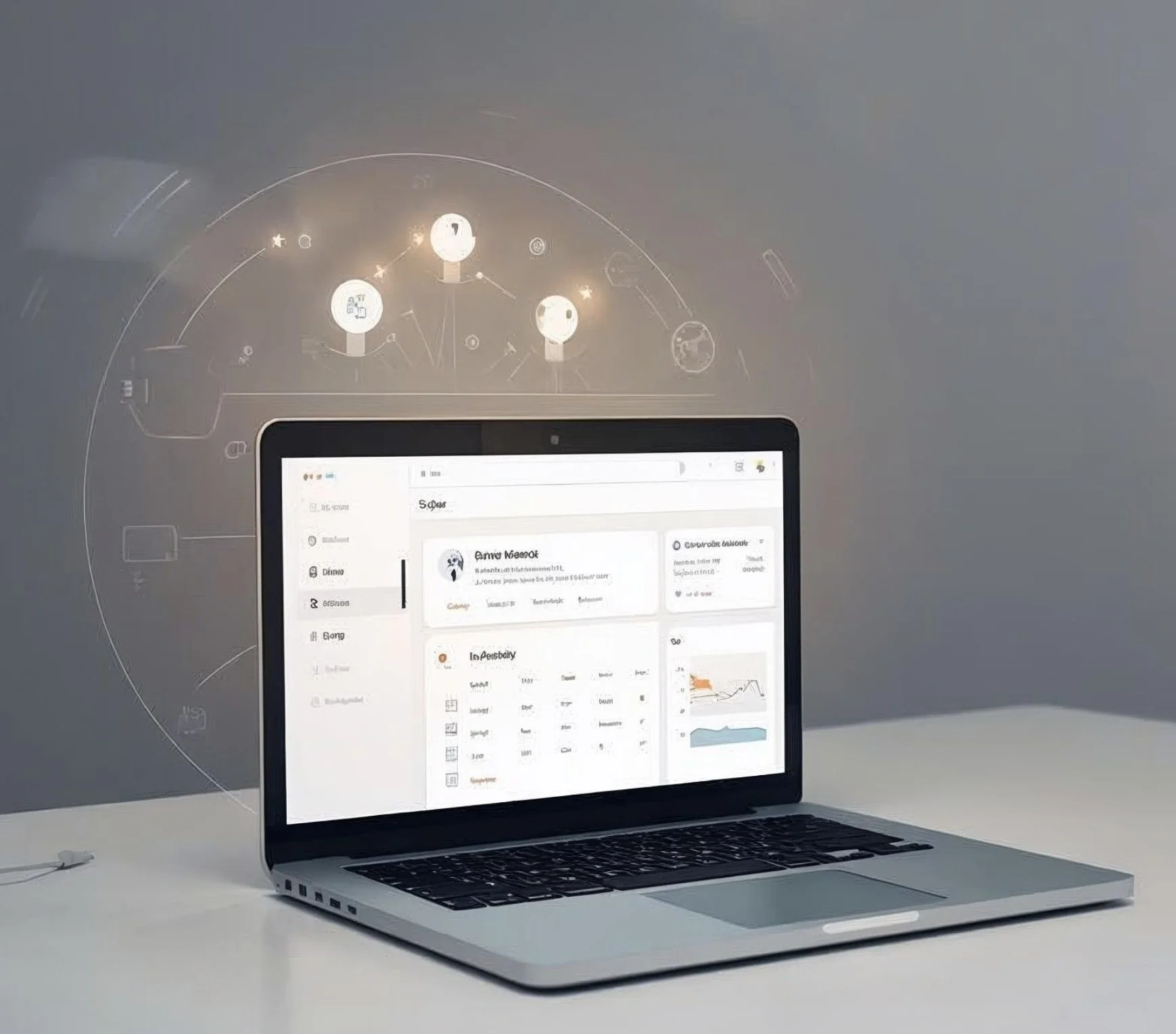 A laptop on a clean workspace displaying a business dashboard, with subtle AI interface elements highlighting how AI supports small business tasks.